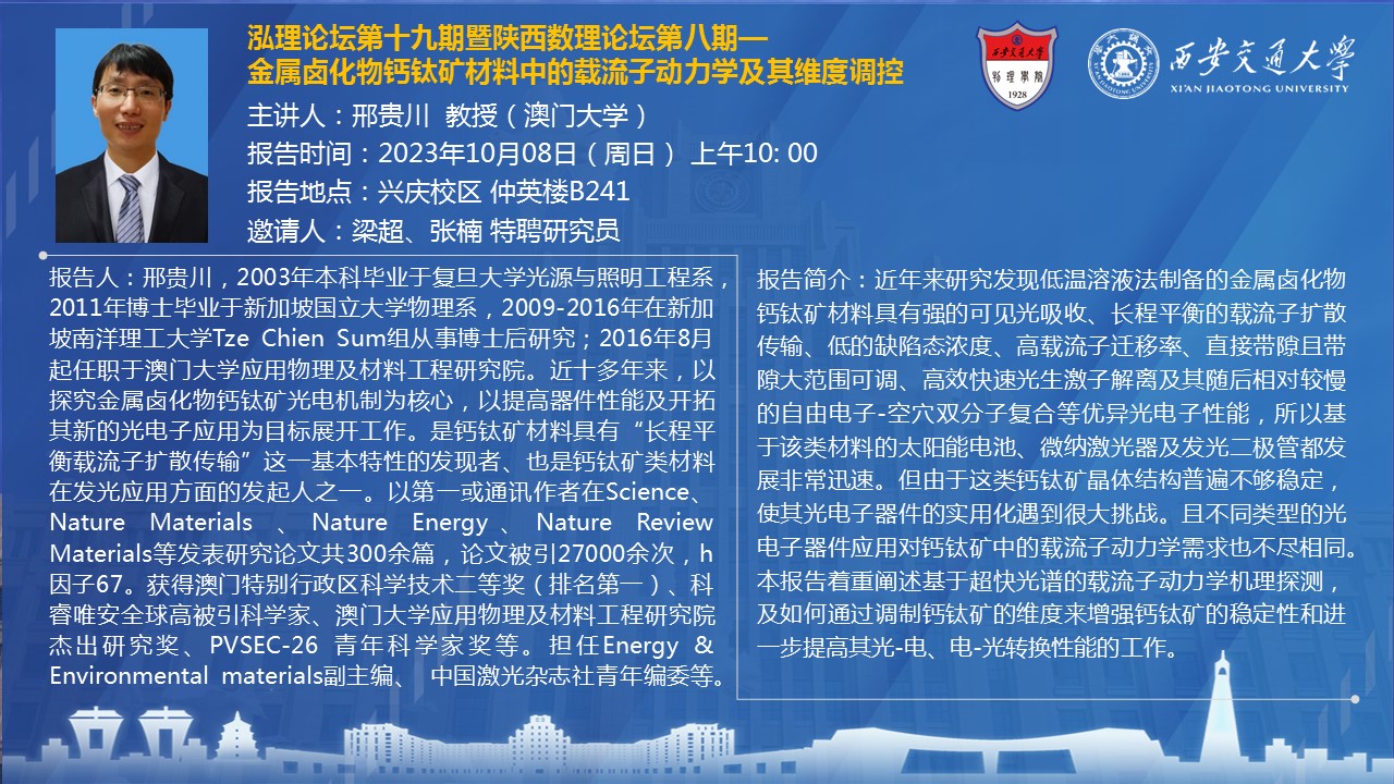 【泓理论坛第十九期暨陕西数理论坛第八期】——金属卤化物钙钛矿材料中的载流子动力学及其维度调控