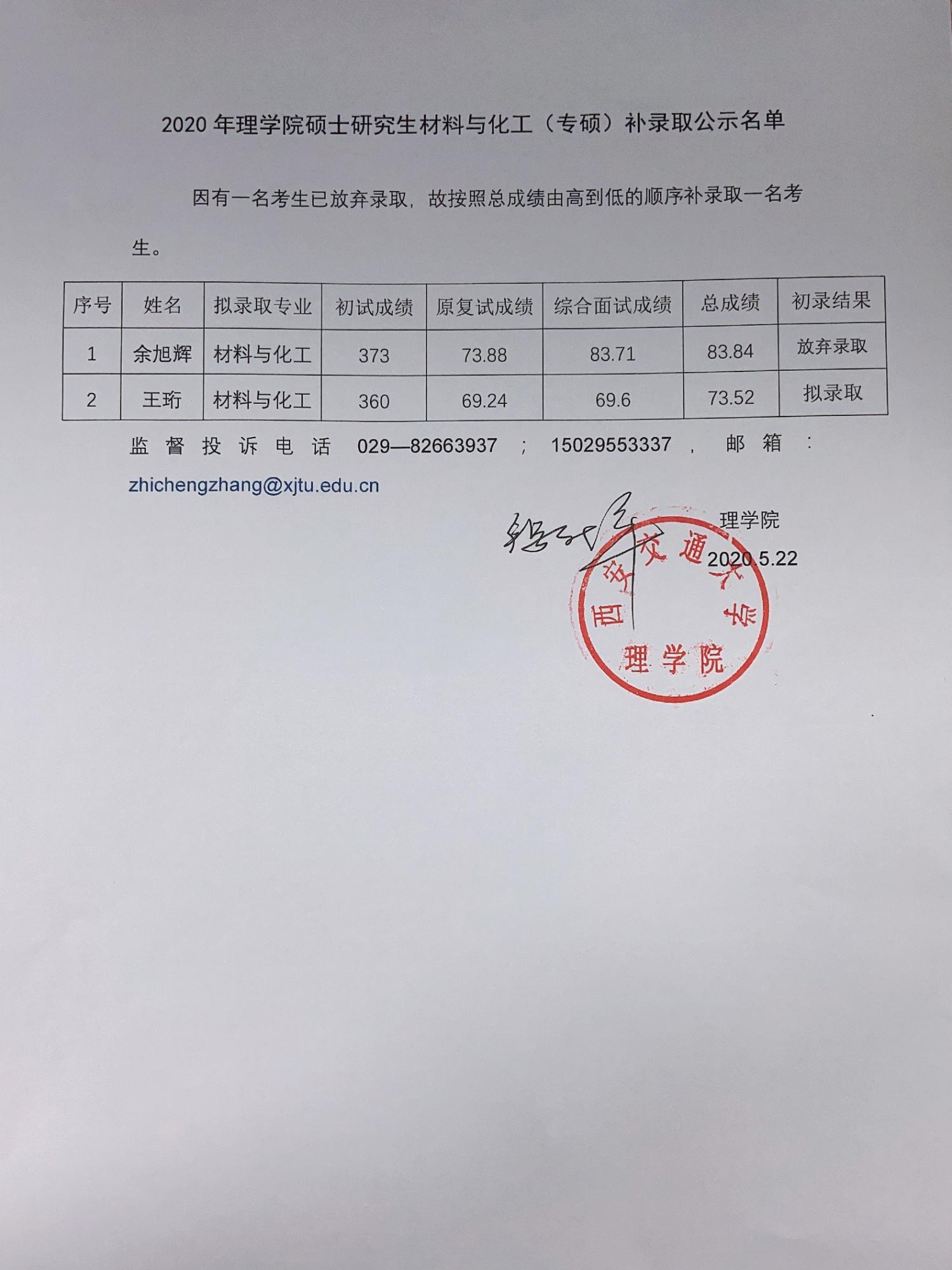 2020年理学院硕士研究生材料与化工(专硕)补录取公示名单