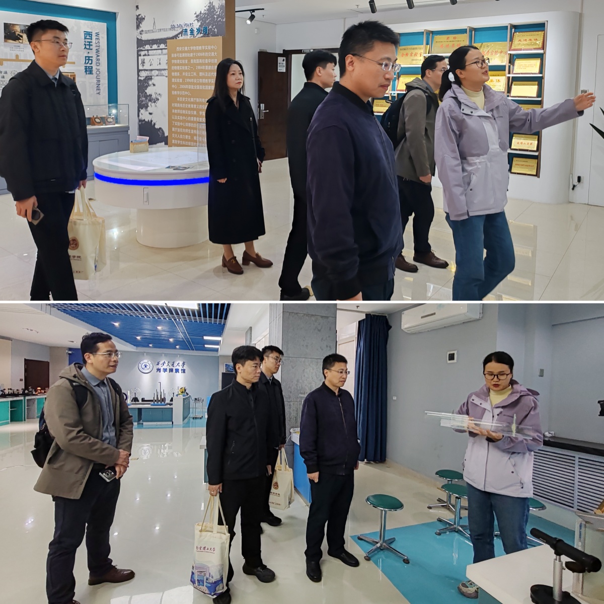 调研团还参观了我校大学物理实验室、国家级实验教学历史文化展厅和光学探索馆,深入了解了我校物理实验教学的发展脉络、特色成果以及在光学科普领域的探索,对我校深厚的教学积淀和创新实践表示赞赏。
