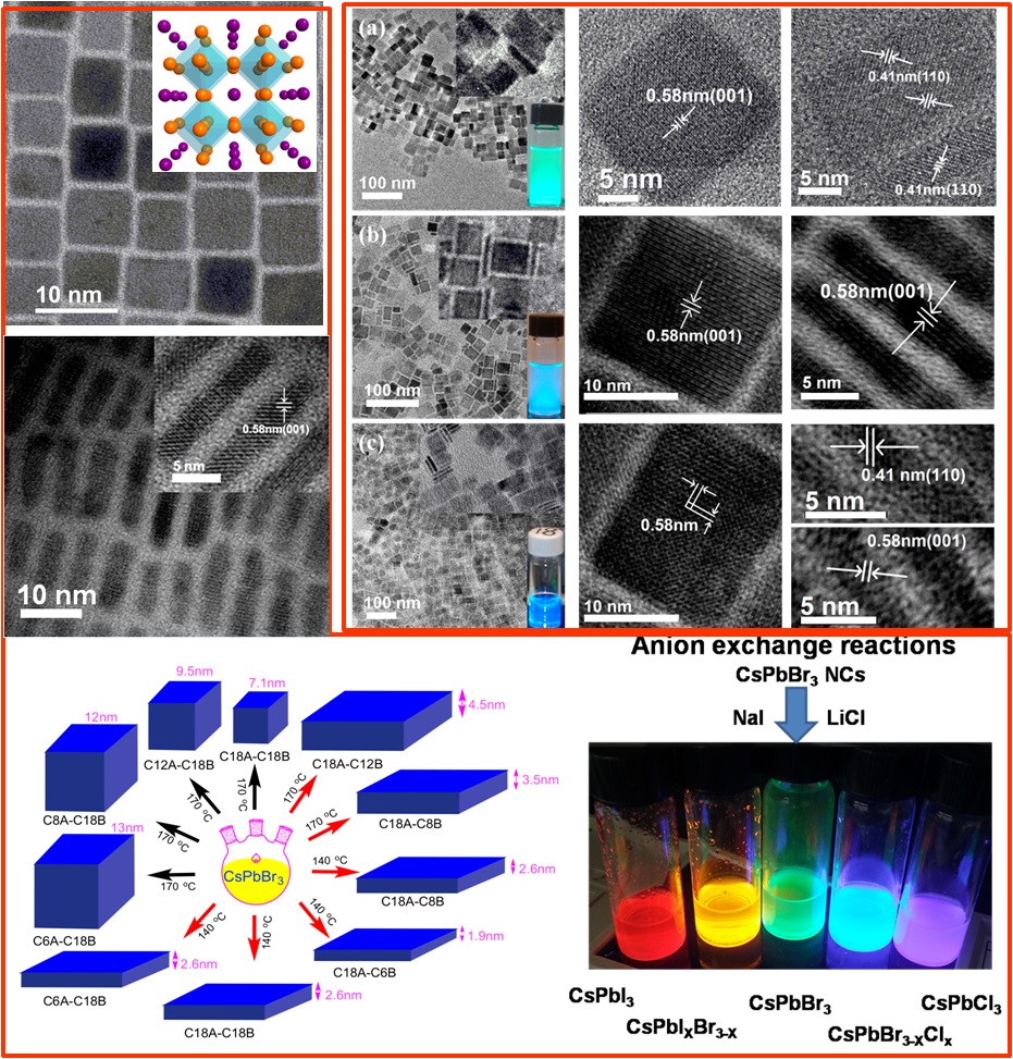 半导体胶体量子点,具有水热法制备、易加工、颜色可调、荧光量子产率高等突出特点,在LED、显示屏、太阳能电池、激光、光电探测器等光电器件领域具有广泛的应用前景。而全无机钙钛矿量子点(CsPbX3,X=Cl,Br,I),具有较窄的峰宽(15~25 nm)、更广的色域(150%NTSC)等优势,因此在量子点显示领域具有更为重要的应用前景。在该研究工作中,作者通过改变不同的Cs盐,不同链长短的配体组合及不同的反应温度等参数,成功制备得到了结晶度极高、形貌均一且可控、尺寸分布窄、荧光量子效率极高的全无机钙钛矿量子点。通过改变不同配体的长度比例和温度等参数,也成功实现了不同形貌的可控制备(不同尺寸的量子点与不同厚度的纳米薄片),量子点发光颜色可控,尺寸分布窄,荧光量子效率高达90%,同时也进一步分析了配体和温度等因素对形貌调控的内在机理。该研究结果对于制备具有高荧光量子效率、形貌核尺寸可调控的纯无机钙钛矿量子点提供了一种新途径,也具有潜在的应用价值。