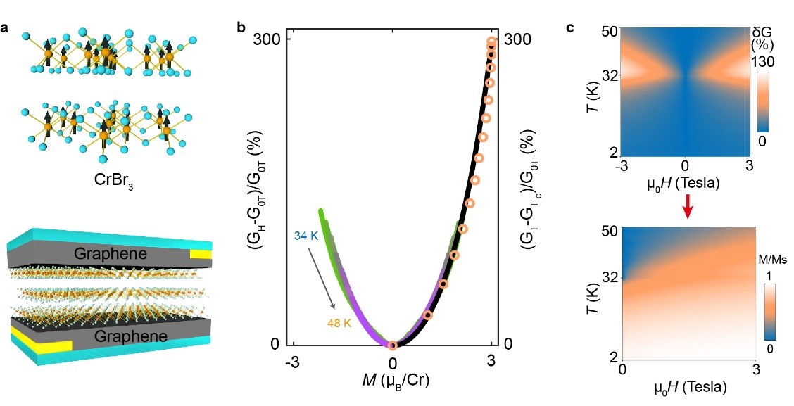 图1. (a)CrBr3晶体及隧穿结示意图。(b)隧穿磁电导对磁化强度的依赖关系,其中黑线为理论拟合数据。(c)通过隧穿磁电导得到二维磁体的磁化强度。