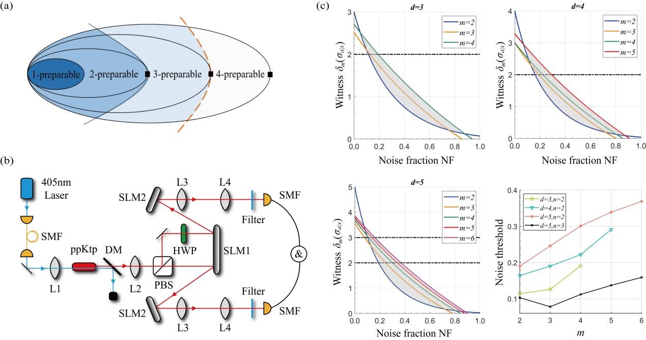 图:(a)有效导引结构;(b)双光子高维导引实验;(c)理论结果