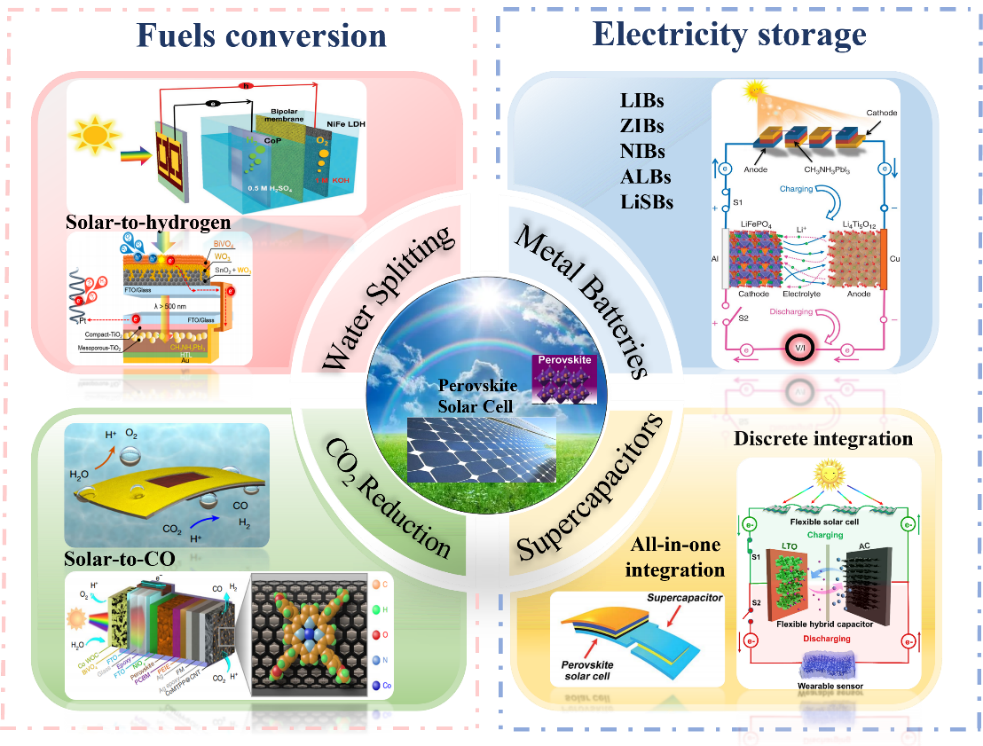 金属卤化物钙钛矿太阳能电池因其具有低成本、高效率的优势,在过去的十年中受到了广泛的关注。持续提高光电转化效率是钛矿太阳能电池发展的关键,但同时也面临着能源储存的困境,导致潜在的资源浪费。将太阳能转化为化学燃料被视为促进能源多样性和提高其利用效率有效途径。将金属卤化物钙钛矿太阳能电池与电化学转换系统进行集成,将光能的捕获、转换和存储一体化,可以显著提升光能的综合利用效率。基于此,西安交通大学的梁超研究员、杨生春教授与澳门大学的邢贵川教授合作,系统总结了钙钛矿太阳能电池驱动的电化学燃料转换、电催化还原和电能存储系统的集成于发展现状。重点介绍了基于钙钛矿太阳能电池的新兴光电化学器件开发,包括自充电电池组、无辅助太阳能水裂解/CO2还原等领域的研究进展,并对该领域所面临的科学挑战进行了分析和展望。上述工作近日分别以(Perovskite Solar Cell Powered Integrated Fuel Conversion and Energy Storage Devices)和(Recent Progress in Perovskite-Based Reversible Photon–Electricity Conversion Devices)为题分别发表在国际知名期刊Advanced Materials和Advanced Functional Materials。论文第一作者为西安交通大学澳门巴黎人赌场