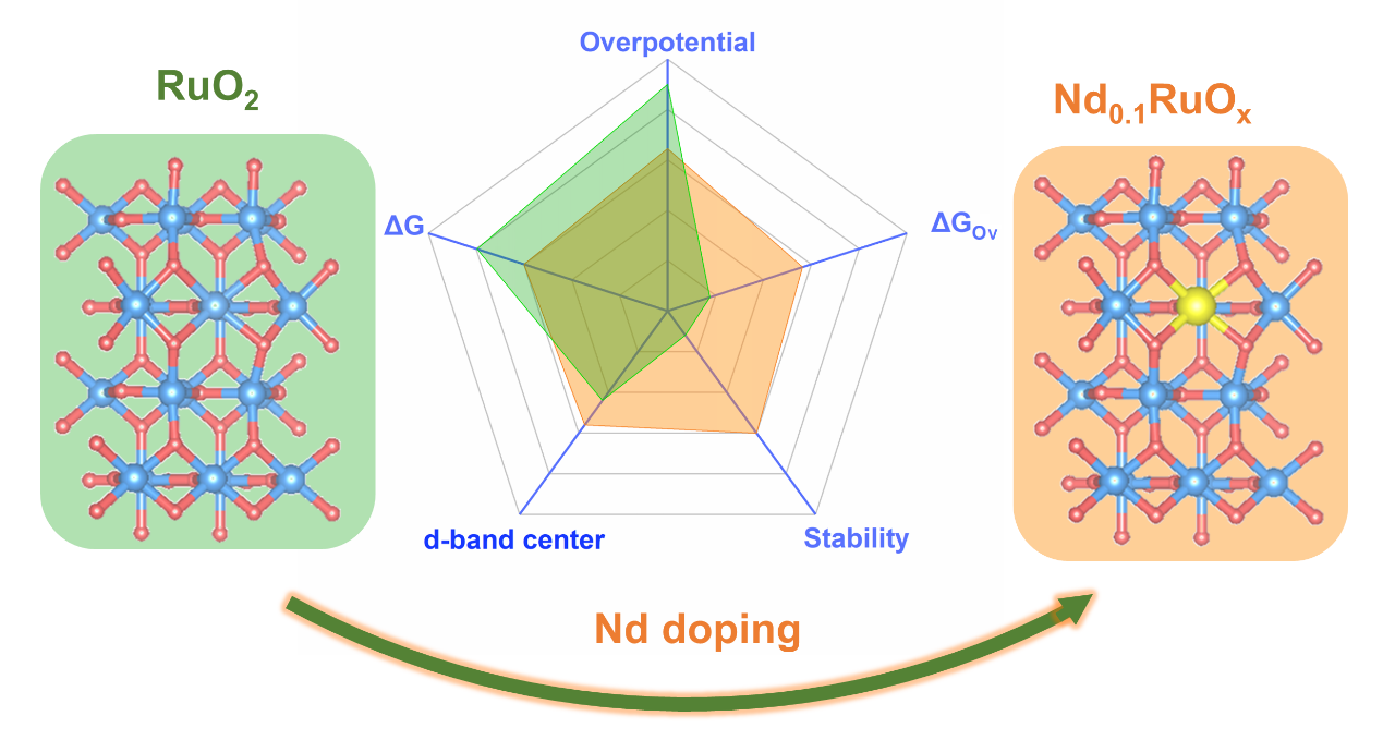 杨生春教授和王斌副教授基于d带中心理论,设计了能够在酸性电解液中稳定工作的Nd掺杂RuO2(Nd0.1RuOx)析氧催化剂,其在10 mA cm−2电流密度下的过电势仅为211 mV,并表现出优异的耐久性。理论计算表明,Nd的引入能够调控Nd0.1RuOx的d带中心能量,有效平衡了含氧中间体的吸附和解吸,降低了反应决速步(O*àOOH*)的能垒,从而加速了Nd0.1RuOx的析氧反应过程。此外,Nd掺杂还使得Nd0.1RuOx的O 2p能带中心下移,表明Nd0.1RuOx中Ru-O的共价性减弱,使其在热力学上不利于发生直接O-O耦合基元反应步骤。同时,Nd0.1RuOx中高比例的Ru4+有效抑制了析氧过程中Ru在酸性电解质中的溶解。将Nd0.1RuOx/CC作为析氧阳极组装于PEM电解槽中后可以在10 mA cm−2下稳定运行50 h,展示出优异的稳定性。该研究通过设计RuO2的电子结构,为酸性电解质中OER催化剂的设计提供了新思路。上述研究工作近日以(Optimizing the Electronic Structure of Ruthenium Oxide by Neodymium Doping for Enhanced Acidic Oxygen Evolution Catalysis)为题发表在国际知名期刊Advanced Functional Materials。论文第一作者为西安交通大学澳门巴黎人赌场