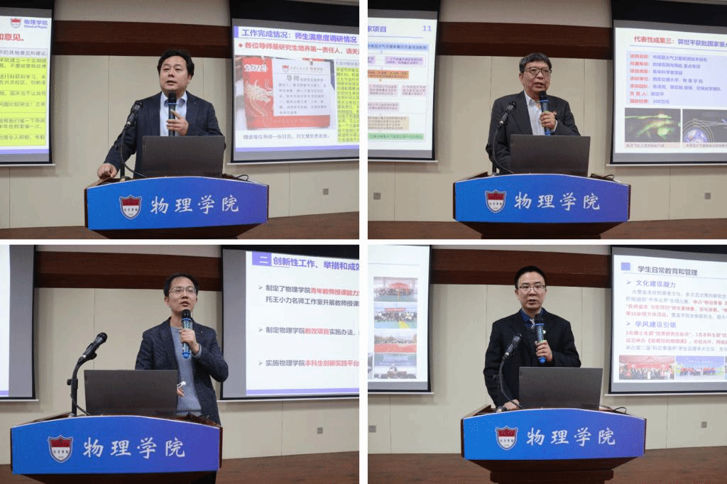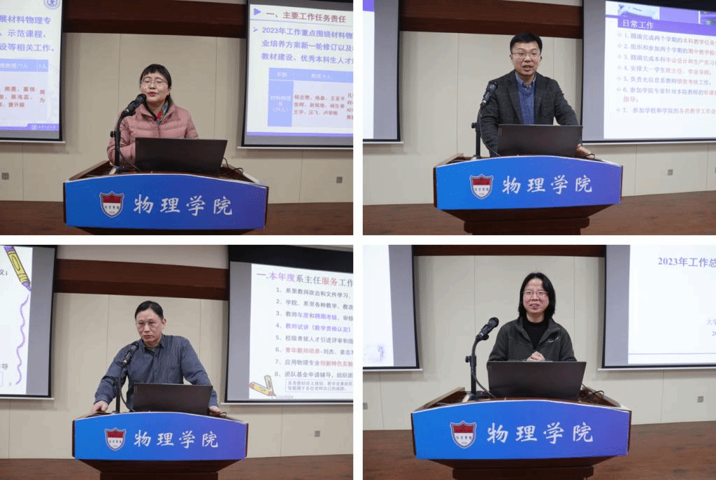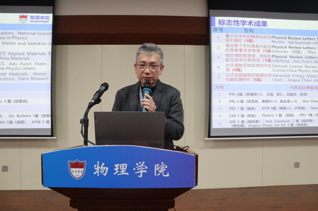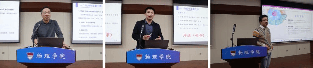 在队伍建设、科学研究、人才培养和综合管理服务工作等方面都取得了喜人成绩。高宏重点汇报队伍建设、学科建设情况,在学校的大力支持下,学院在人才队伍建设方面突破明显,物理学科在教材出版、课程建设、教学成果奖、学术成果、科研到款等各方面都取得显著成效。2024年学院要明确重点发展方向,明确人才培养、科学研究等工作目标,要瞄准国家重大需求不断推进内涵式高质量发展。