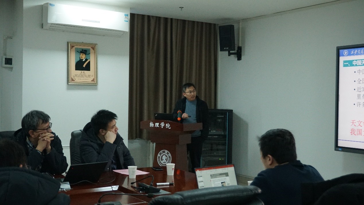 张莹首先代表学院向刘海文教授的莅临表示热烈欢迎,并从国家战略发展、学校十四五规划布局和学院学科发展三个方面介绍了天文学科发展的重要意义。随后左兆宇教授代表学院天文研究团队,介绍了国内高校及地方天文发展现状,并分析了学科发展态势,指出西安交通大学发展天文学科的必要性、紧迫性和可行性。