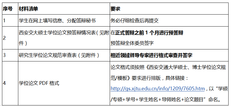 3.需提交材料及相关要求:学位论文PDF格式,论文格式须按照《西安交通大学硕士、博士学位论文规范/模板》要求进行排版,以“学硕/专硕+学号+学生姓名+导师姓名+论文题目”命名。由答辩秘书在5月15日之前通过邮件发至xiaoaiguo@amblrdc.com,由学院统一进行查重。
